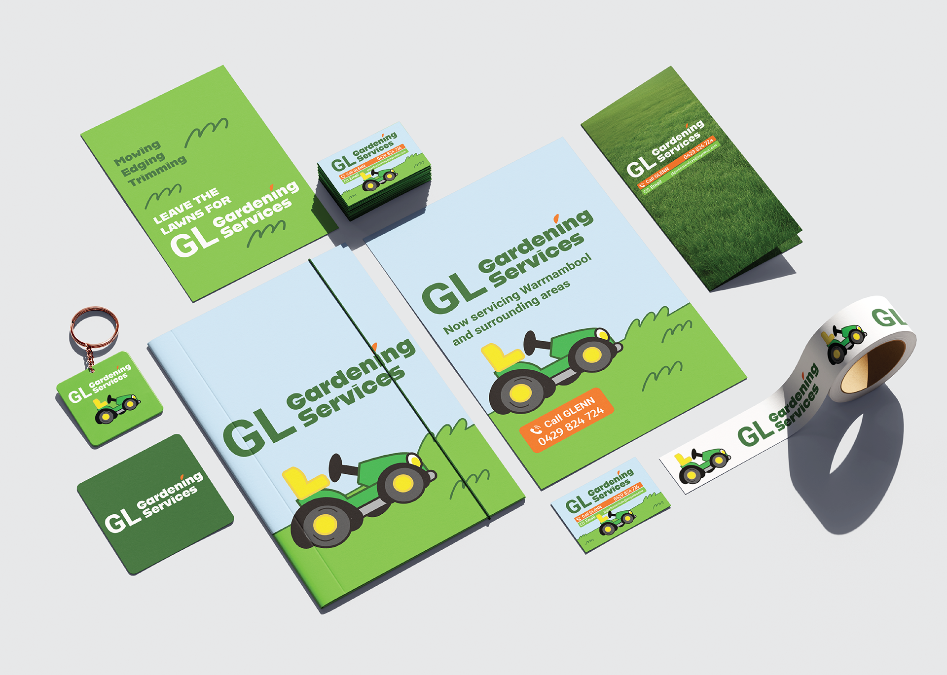 GL Gardening Services is a lawn mowing business located in Warrnambool, Victoria which I created a logo and advertising material.